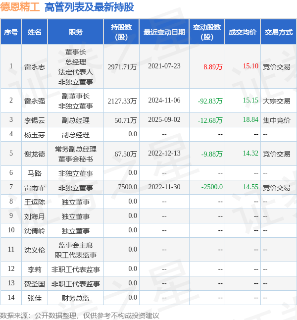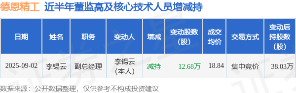 德恩精工近半年内的董监高及核心技术人员增减持详情如下:
